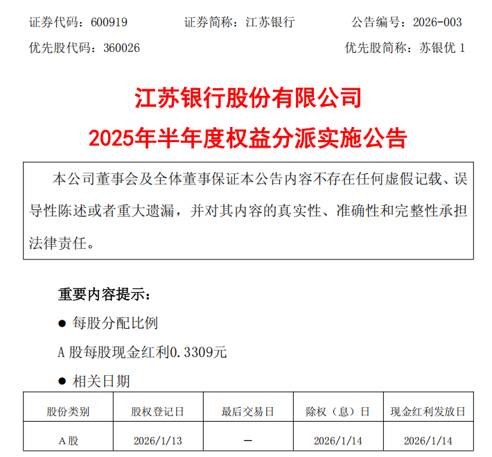 2026年1月8日,江苏银行《2025年半年度权益分派实施公告》,A股每股现金红利0.3309元,合计派发现金红利60.72亿元,股权登记日为2026年1月13日,除权除息日与现金红利发放日均为2026年1月14日。