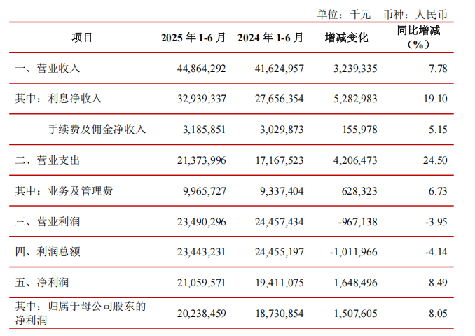 而将江苏银行2025年半年度报告与其第三季度报告结合来看,可以看到阶段变化。其半年报显示,其上半年营业收入同比增长7.78%,利息净收入同比增长19.10%,手续费及佣金净收入同比增长5.15%,归属于母公司股东的净利润同比增长8.05%。