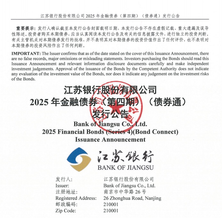 2026年1月8日,江苏银行发布《2025年半年度权益分派实施公告》,公告明确A股现金红利发放日为2026年1月14日。而针对资金来源方面,江苏银行则在2025年12月15日发布《江苏银行股份有限公司2025年金融债券(第四期)(债券通)发行公告》,公告所列发行规模为150亿元,期限为3年。