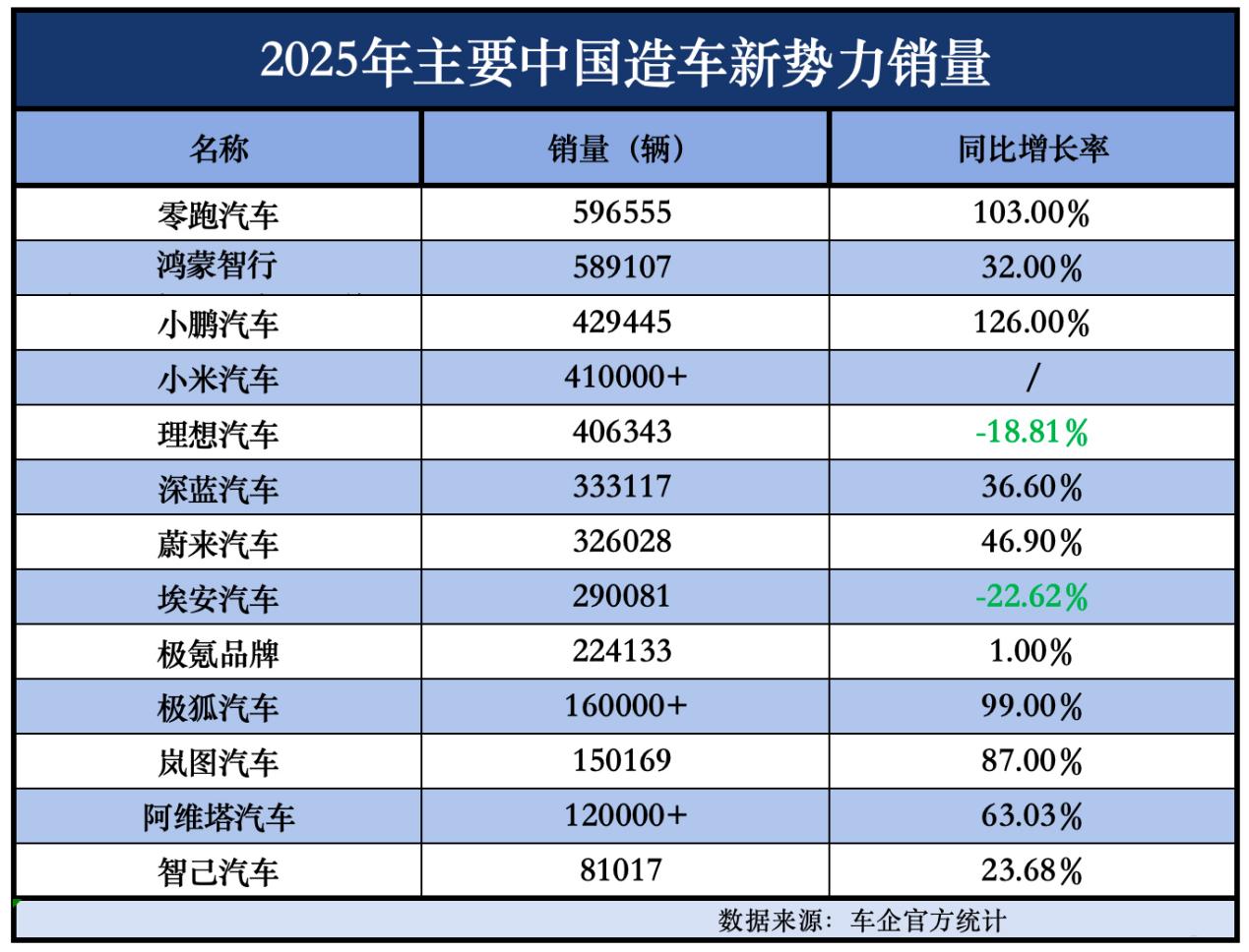 SmartHey统计13家主流造车新势力2025年销量了解到,除了理想汽车、埃安汽车销量分别同比下滑18.81%、22.62%,其它造车新势力都呈现同比增长状态,增速排名前三的小鹏汽车、零跑汽车和极狐汽车分别同比增长126%、103%和99%,展现出极强的抗压能力。