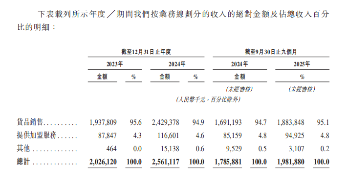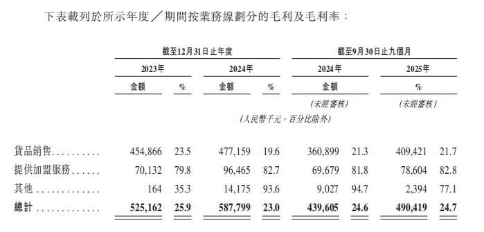 进一步看招股书按业务线披露的毛利率,2023年货品销售为23.5%,提供加盟服务为79.8%,其他为35.3%,2024年分别为19.6%、82.7%、93.6%,截至2024年9月30日止9个月分别为21.3%、81.8%、94.7%,截至2025年9月30日止9个月分别为21.7%、82.8%、77.1%。