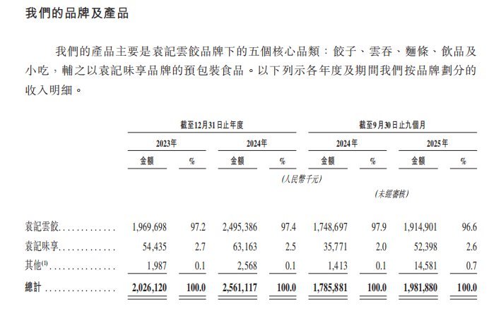高占比意味着增长的主战场仍在主品牌,品牌势能与门店网络规模强绑定,资源投放与经营重心较集中,带来的优势是聚焦,带来的代价是对单一品牌曲线的依赖更强。从品牌贡献看,招股书披露的按品牌收入占比中,2023年袁记云饺为97.2%,袁记味享为2.7%,其他为0.1%,2024年分别为97.4%、2.5%、0.1%,截至2024年9月30日止9个月分别为97.9%、2.0%、0.1%,截至2025年9月30日止9个月分别为96.6%、2.6%、0.7%。