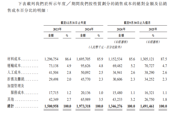 但集中度下降不一定必然带来更强的供给效率,供应商数量增加,协同成本会同步上升,标准统一、批次一致、交付准点、异常处置等环节都更依赖组织能力。成本侧的数据则进一步放大了这种敏感性,据其招股书,于2023年、2024年以及截至2024年及2025年9月30日止九个月,袁记云饺的原材料成本分别占总销售成本的86.4%、85.9%、85.6%及87.5%。