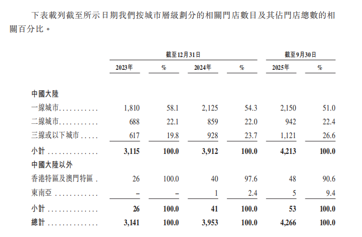 从门店网络的地域分布看,其也在发生一定倾斜。招股书显示,截至2023年12月31日,一线城市门店占比为58.1%,截至2025年9月30日为51.0%。同期二线城市门店占比分别为22.1%与22.4%,三线或以下门店占比分别为19.8%与26.6%。