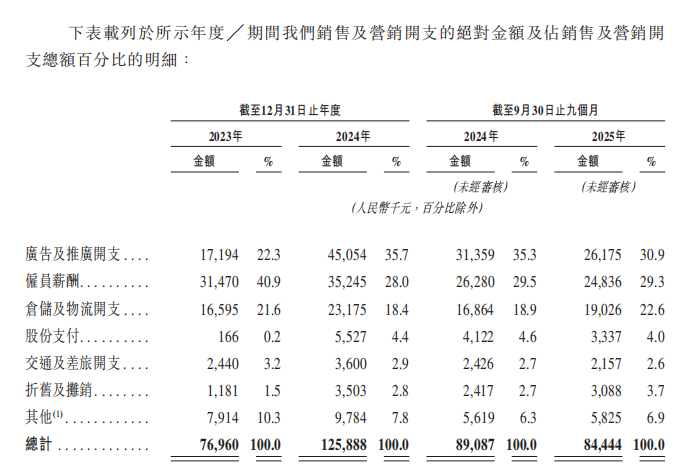 成本端的构成也佐证了这一点。对于依赖供货的袁记云饺总部而言,采购、供应商分散度以及仓配效率,都会影响材料成本能否稳定,进而影响整体毛利率能否维持在一个更可预期的区间。费用端同样需要关注,据其招股书,2023年销售及营销开支中广告及推广开支占比为22.3%,2024年为35.7%,截至2024年9月30日止9个月为35.3%,截至2025年9月30日止9个月为30.9%。2024年较2023年提高,2025年前9个月较2024年前9个月下降,但仍高于2023年。