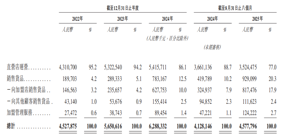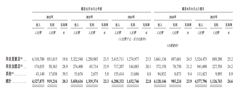 然而,加盟业务却显示出更大的波动性,招股书显示,其来自加盟店的毛利率在2022年为28.9%,2023年为23.9%,2024年为20.1%,截至2025年8月31日止8个月为24.2%,但轨迹与直营截然不同。这在一定程度上表明,加盟占比从10.5%至44.2%的快速提升并非利润的“提款机”,其毛利更易受供应链定价、服务成本及扩张的影响,管理难度可见一斑。