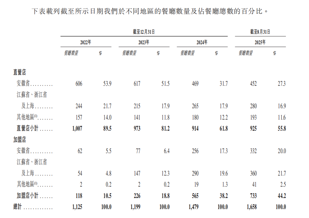 扩张方式的变化,是理解这门生意的第一把钥匙。一连串快速攀升的加盟占比数据,揭示了老乡鸡增长引擎的切换。招股书显示,截至2022年12月31日、2023年12月31日、2024年12月31日及截至2025年8月31日,加盟店占餐厅总数的比重分别为10.5%、18.8%、38.2%及44.2%。这意味着增长动能正更多来自加盟网络,总部从“开店能力”延展到“网络治理能力”,其中包含选址、培训、供货、督导、品控与费用管理等一整套日常管理。