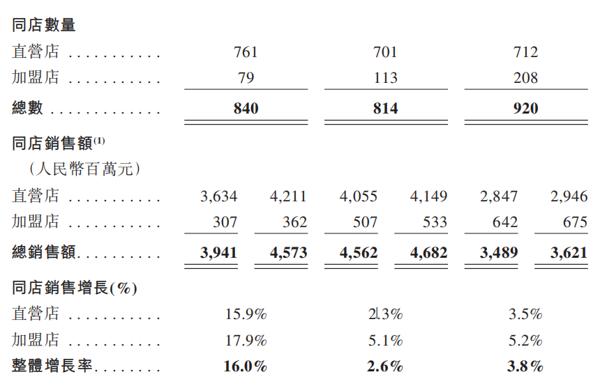 抛开总量看单店,同店销售增速的细微差异,恰恰是评估其加盟扩张健康度的重要标尺。招股书显示,2022年至2023年整体同店销售增长率为16.0%,直营店为15.9%,加盟店为17.9%。进入2023年至2024年,其整体同店销售增长率为2.6%,直营店为2.3%,加盟店为5.1%。截至2025年8月31日止8个月,整体同店销售增长率为3.8%,直营店为3.5%,加盟店为5.2%。