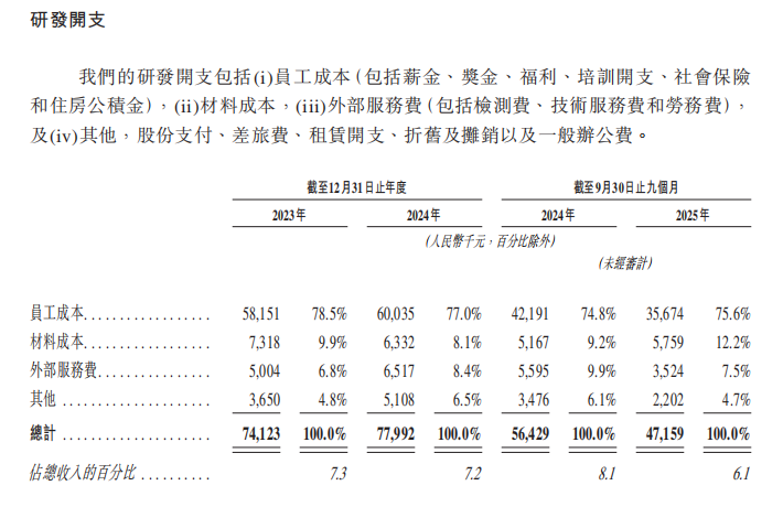 再看研发投入强度。按截至12月31日止年度来看,其研发开支占总收入在2023年为7.3%,2024年为7.2%。这同样接近稳定,意味着公司在保持持续研发投入。截至2024年9月30日止9个月为8.1%,而在截至2025年9月30日止9个月,则降至6.1%。