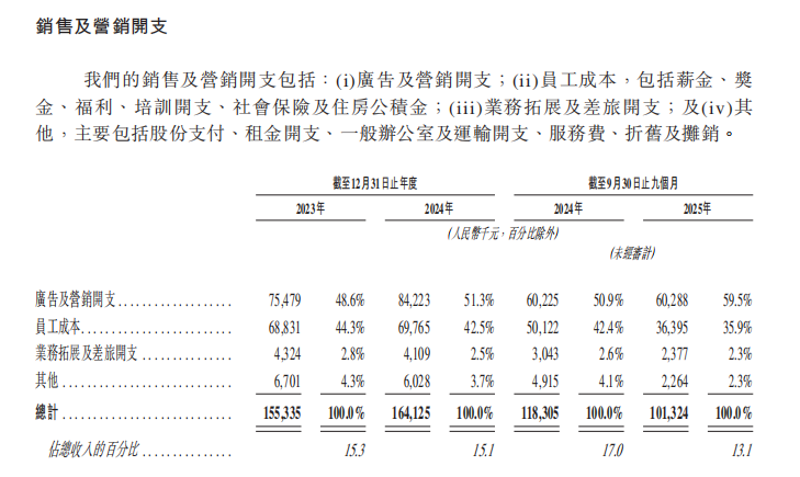 从其招股书显示的销售及营销费用投入强度看,按截至12月31日止年度看,其销售及营销开支占总收入2023年为15.3%,2024年为15.1%。而截至2024年9月30日止9个月为17.0%,截至2025年9月30日止9个月降至13.1%。