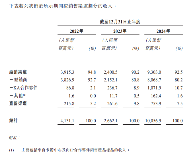 更进一步,卡游还面临一个现实难题。其招股书显示,经销渠道收入占比在2024年为92.5%,直营渠道收入占比在2024年为7.5%。当经销占比很高,企业对终端销售环境的掌控力天然有限。而直销越强,企业越要承担更直接的社会期待。