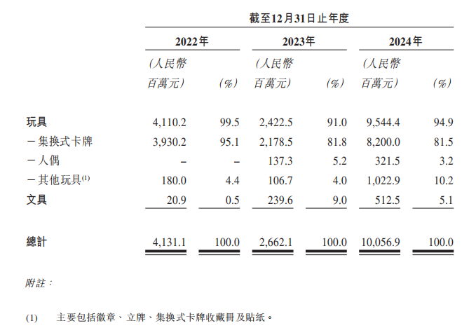 从收入贡献看,集换式卡牌在2022年贡献95.1%,2023年为81.8%,2024年为81.5%,占比下降不改变其仍为第一大收入来源这一事实。这背后含义或并非简单的去单一化成功,数据仍然表明其高度依赖核心品类,同时在边缘品类中寻找缓冲。