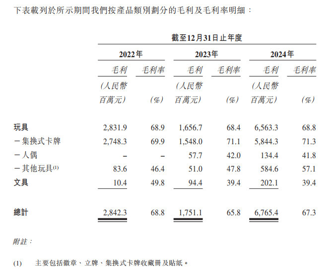 高毛利不等于问题本身。作为经营的结果呈现,毛利将产品形态、内容供给、品类组合呈现同一张成绩单上。但对卡游这类以集换式卡牌为核心的公司而言,毛利高位既意味着产品能持续卖出超出实物属性的价值,也意味着毛利高位既是优势,也是要求。卡游招股书显示,其整体毛利率在2022年为68.8%,2023年为65.8%,2024年为67.3%。