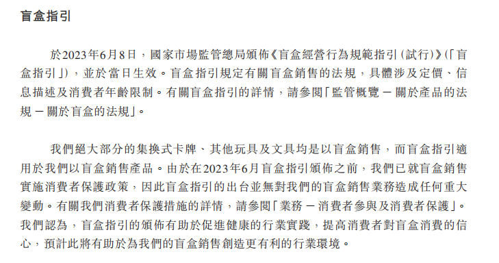 值得注意的是,卡游进一步在其招股书中指出,“由于在2023年6月盲盒指引颁布之前,我们已就盲盒销售实施消费者保护政策,因此盲盒指引的出台并无对我们的盲盒销售业务造成任何重大变动。”
