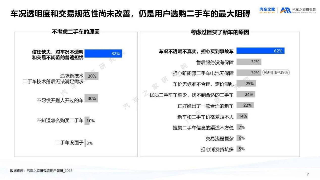 与此同时,汽车之家研究院《二手车市场趋势洞察》(2025)显示,阻碍用户购买二手车的首要因素,仍然是车况透明度和交易规范性不足。在“不考虑二手车的原因”中,82%的受访者提到信任缺失、担忧车况不透明和交易不规范;在“考虑过但最终买了新车的原因”中,62%的受访者提到担心车况不透明、不真实,怕买到事故车,另有32%提到售后服务没有保障,32%提到担心新能源二手车电池无保障。对二手车平台来说,这意味着用户比价时看的已经不只是价格高低,还包括车况说明是否充分、售后是否省心、电池保障是否说得明白。
