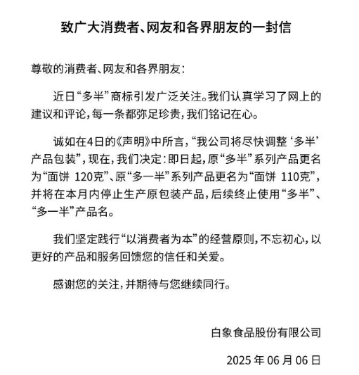 而据央广网2025年6月6日报道,白象食品股份有限公司发布公开信称,决定即日起,原“多半”系列产品更名为“面饼 120克”、原“多一半”系列产品更名为“面饼 110克”,并将在本月内停止生产原包装产品,后续终止使用“多半”“多一半”产品名。