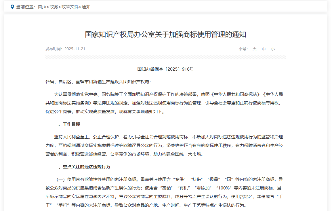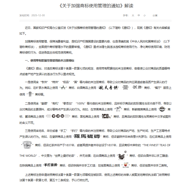 2025年12月30日,国家知识产权局《〈关于加强商标使用管理的通知〉解读》指出,“对违反商标法第十条第一款第七项的规定,使用带有欺骗性的未注册商标,容易使公众对商品的质量等特点或者产地产生误认的违法行为予以重点规范。”并指出,“对欺骗性使用注册商标、违反商标法第四十九条等规定的两类违法行为予以重点规范。”