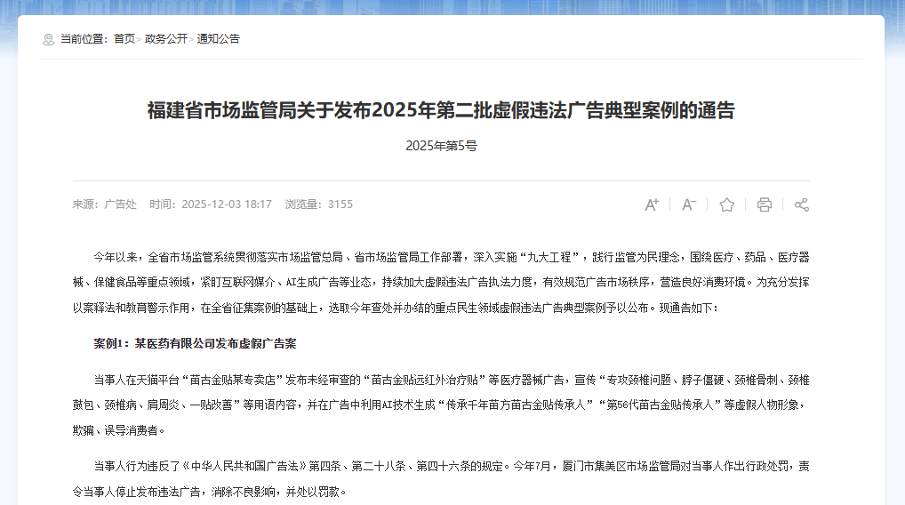 对淘天而言,或更集中地体现在店铺页面、评价、榜单与广告审核等。福建省市场监管局2025年12月3日公布虚假违法广告典型案例提到,某企业在天猫专卖店发布未经审查的医疗器械广告,使用“专攻颈椎问题”“一贴改善”等用语,并借助人工智能合成形象强化背书,最终被处罚。