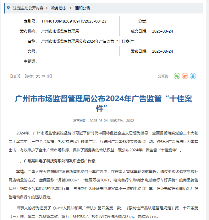 广州市市场监管局2025年3月24日公布广告监管“十佳案件”提到,某天猫旗舰店电动自行车广告夸大续航,组织虚假交易提升销量,使用“月销3000+”“热销榜”“好评榜”等宣称,被没收违法所得72万元并处罚款59万元。