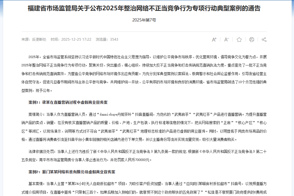 例如,抖音面对的,或是主要来自直播与短视频交易。福建省市场监管局2025年12月25日公布网络不正当竞争典型案例提到,梁某通过抖音直播间营销“武夷岩茶”“武夷红茶”,在未核实质量、价格、产地、生产包装、执行标准等信息的情况下,使用“正岩”“核心产区”等用语,构成虚假宣传,被罚款70万元。