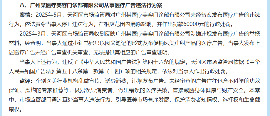 小红书的处境,则体现在社区推荐与种草这一平台定位。广州市市场监管局2025年12月29日公布违法广告典型案例提到,广州简某健康科技通过微信公众号、小红书等平台推销儿童叶黄素等商品,发布“预防近视、改善视力、提高免疫力、抵御过敏原”等虚假用语,被罚款60万元。该局2025年12月3日发布的2025年“民生铁拳”第四批案例提到,某医美门诊通过小红书账号发布促销医美注射商品的医疗广告,未经审查即对外发布,被行政处罚。