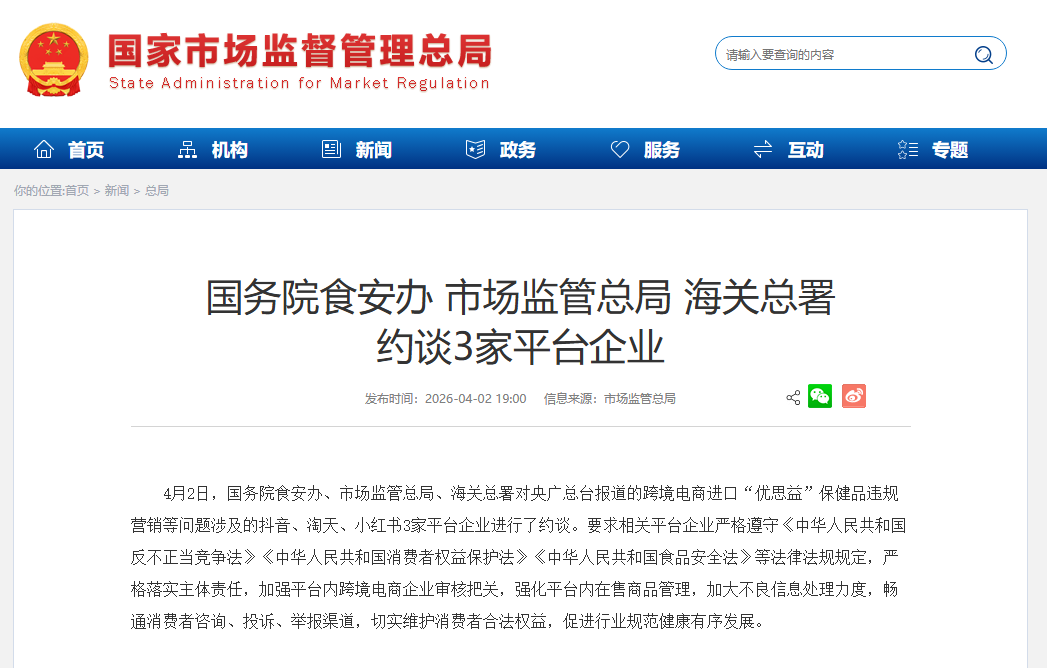 据央视新闻2026年4月2日报道,当日,国务院食安办、市场监管总局、海关总署对央视报道的跨境电商进口“优思益”保健品违规营销等问题涉及的抖音、淘天、小红书3家平台企业进行了约谈。