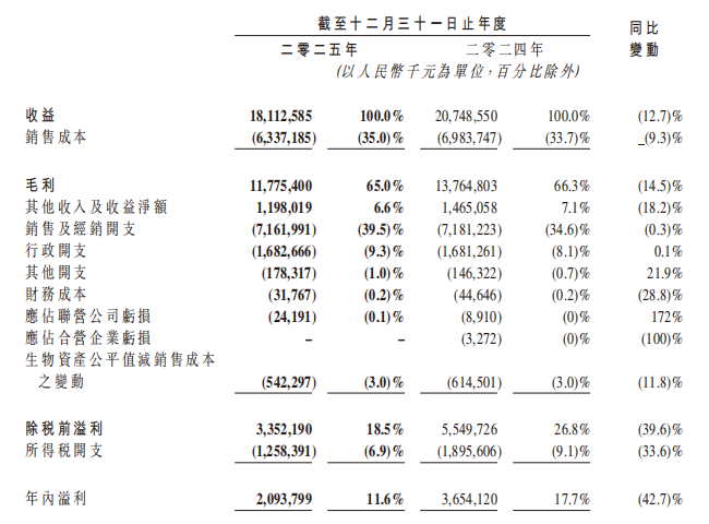 财报显示,其全年营收为181.1亿元,同比下滑12.7%;归母净利润19.39亿元,同比下滑45.68%。毛利为117.75亿元,同比下降14.5%,年内溢利为20.94亿元,同比下降42.7%。营收、毛利和年内溢利在2025年同步下降,且利润降幅明显大于收益降幅。