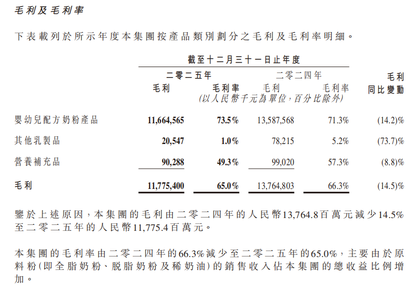 从毛利角度来看,如前所述,飞鹤2025年整体毛利率下滑、婴幼儿配方奶粉毛利率虽仍为73.5%,高于2024年的71.3%,但其他乳制品毛利率由5.2%降到1.0%。对此,财报提到,“本集团的毛利率由二零二四年的66.3%减少至二零二五年的65.0%,主要由于原料粉(即全脂奶粉、脱脂奶粉及稀奶油)的销售收入占本集团的总收益比例增加。”
