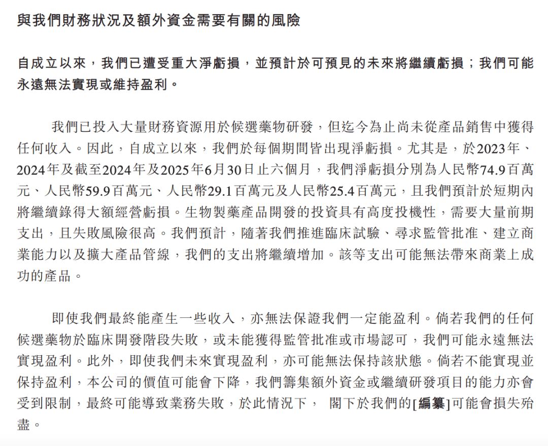 公司在招股书中坦承:“即使我们最终能产生一些收入,也无法保证一定盈利。倘若候选药物在临床或注册阶段失败,我们可能永远无法实现盈利;即使未来实现盈利,也可能无法维持该状态。”