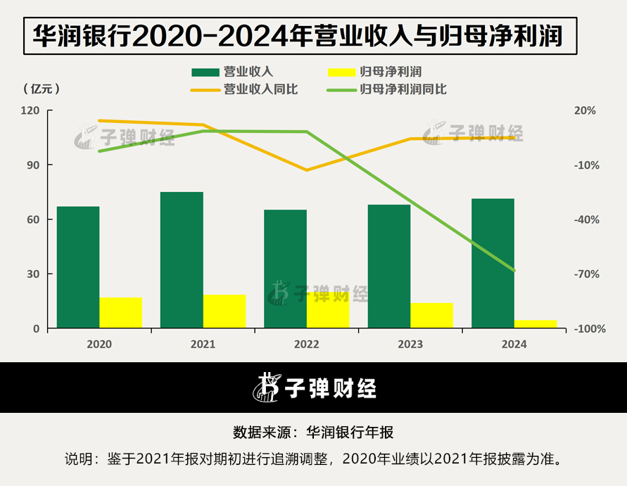 将时间往前倒推,2020年至2024年,华润银行的营收分别为66.99亿元、74.99亿元、65.23亿元、68亿元和71.32亿元,同比增速分别为14.19%、11.94%、-13.02%、4.26%和4.87%。