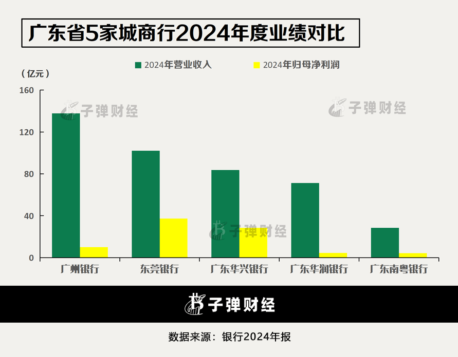 更进一步将广东省5家城商行的2024年业绩横向对比来看,华润银行的营业收入为71.32亿元,归母净利润达到4.44亿元,在广东城商行中位列第四,排名相对靠后。