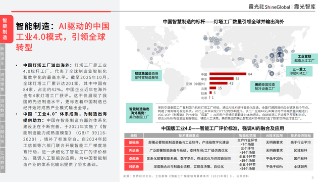 灯塔工厂是工业4.0标杆工厂,代表了全球制造业智能化和数字化的最高水平。截至2025年10月,全球灯塔工厂累计数量达201家,其中中国有84家,占比约为42%。中国企业近年在海外也有4家灯塔工厂获评。这不仅展现了我国的先进制造水平,更标志着中国制造已经开始将成熟产业模式输出全球。