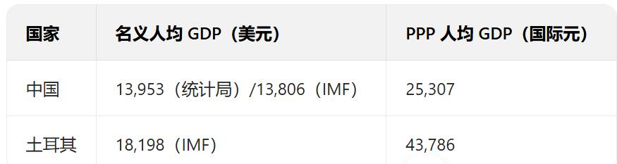 土耳其的名义人均GDP和实际购买力均高于中国