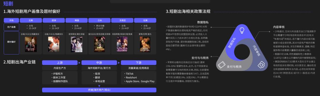 2026年,泛娱乐出海的核心驱动力已从单纯的商业模式输出转向"AI+文化"的深度赋能。以短剧和漫剧为例,国内市场2025年规模已达677.9亿元,同比增长34.4%,而海外市场增速更加迅猛,规模预计达210.7亿美元,增长145.7%。随着可灵等AI视频模型的成熟,漫剧凭借低成本、高产能和强视觉冲击力,正接棒成为内容增量的主力军。在区域策略上,欧美市场追求精品化与高制作标准,而东南亚、中东等新兴市场则更看重贴合当地文化的题材改编与情感共鸣。游戏领域同样如此,玩法、题材多点开花,但成功出海的头部玩家无不深耕本地化运营,将中国的自研能力与全球审美情趣精准结合。