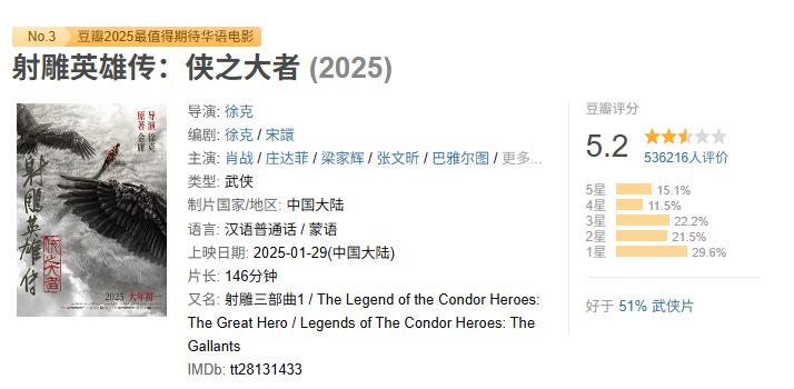 过去几年,部分项目用“大IP+大导演+顶流”拉满预期,但内容交付不足,导致观众对“背书体系”的信任被反复消耗。结果就是:观众不再把阵容当作质量承诺,而是把它当作一种“高期待陷阱”。例如《射雕英雄传:侠之大者》豆瓣评分5.2的结果,就典型呈现了“预期—体验错位”的失衡,将流量优势反噬为口碑压力。