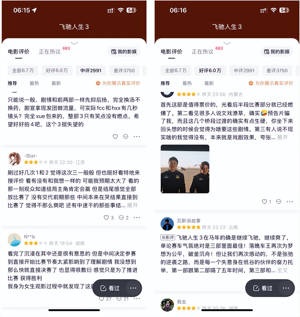 例如,短视频平台上对《飞驰人生3》的评价呈现两极分化,既有观众觉得后半部分近一小时的实景赛车戏份,涵盖戈壁、悬崖等复杂地形,IMAX版本堪称“肾上腺素狂飙”的影院级体验,也有不少观众吐槽其走的仍是“天崩开局+中期起飞+比赛被做局+最终飞越”的老路线,且相比前两部少了轻松幽默,多了严肃说教,甚至被吐槽“中年油腻”。这些评价,或将直接影响后续票房表现。