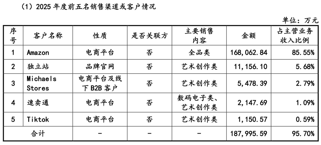 2023年至2025年(以下简称“报告期内”),千岸科技来自亚马逊平台的收入占主营业务收入的比例分别高达93.42%、90.30%、85.55%,尽管占比逐年下降,但近九成收入仍牢牢绑定在亚马逊平台上。