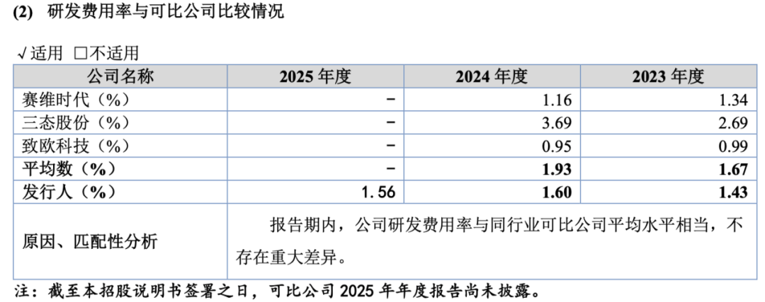 报告期内,千岸科技的研发费用分别为2007.52万元、2671.9万元、3098.41万元,对应研发费用率仅为1.43%、1.60%、1.56%,连续3年远低于3%的门槛,且2023年、2024年持续低于同行业可比公司均值。
