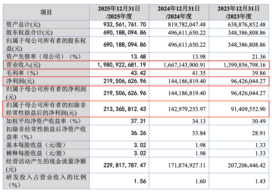 2023年至2025年,公司营收分别为14.00亿元、16.67亿元、19.81亿元,2024年和2025年分别同比增长19.09%和18.82%,增速均为双位数;净利润分别为9642.6万元、1.44亿元、2.2亿元,2024年和2025年分别同比增长49.53%和52.24%。