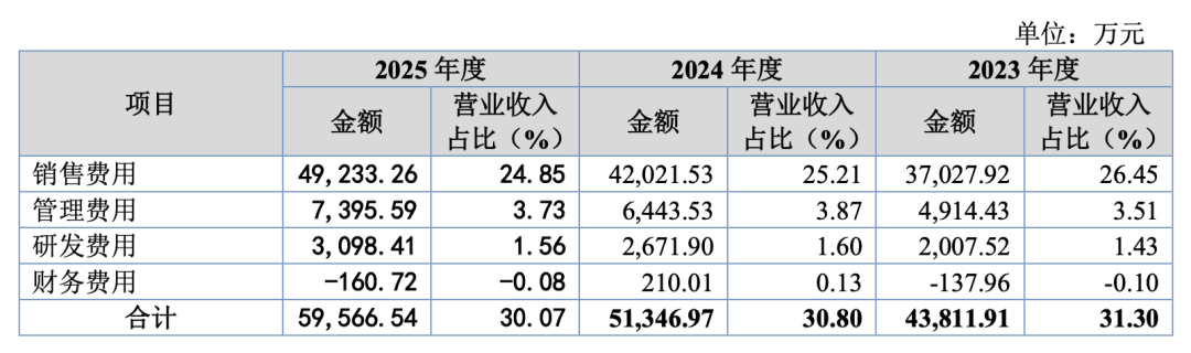 费用结构上,公司明显偏向销售渠道投入。报告期内,其销售费用分别为3.70亿元、4.20亿元、4.92亿元,占营收比例分别为26.45%、25.21%、24.85%。于2025年,销售费用更是研发费用的15.89倍,研发投入规模与销售投入差距悬殊。