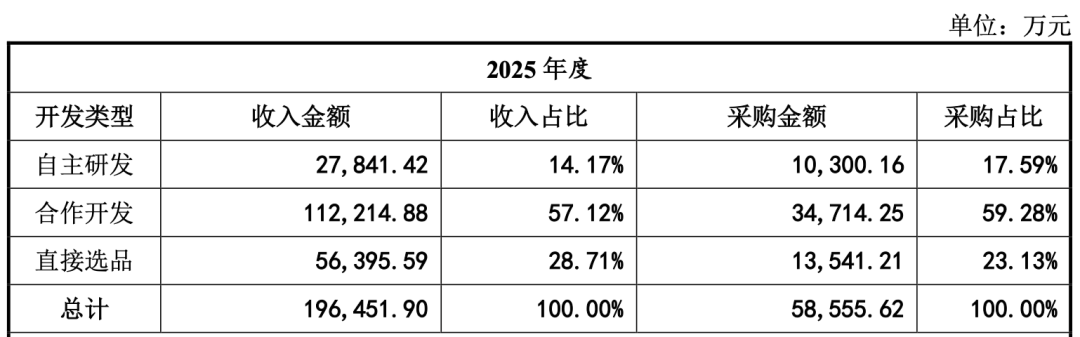 从产品结构来看,千岸科技研发驱动的特征同样不突出。目前,其产品分为自主研发、合作开发与直接选品三类。2025年,自主研发产品收入占比仅14.17%,合作开发产品占比57.12%、直接选品占比28.71%,呈现自主研发产品占比偏低、以合作开发与选品为主的格局。