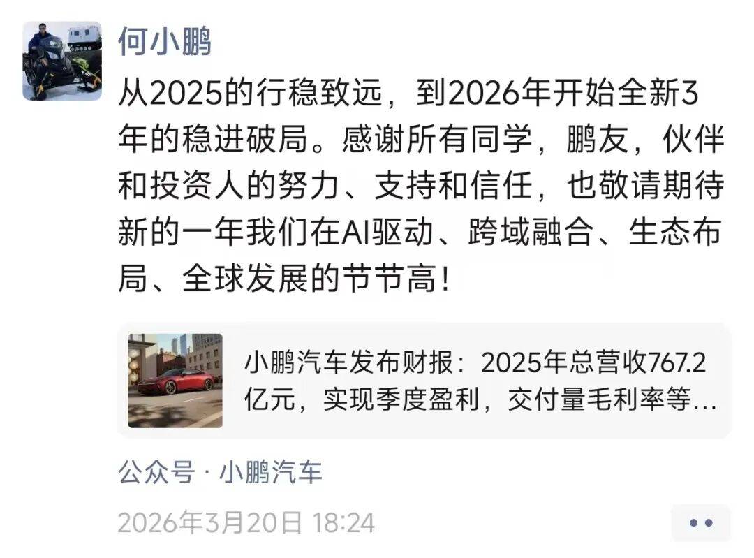 3月20日,何小鹏在朋友圈转发了一篇推文——那是小鹏汽车2025年第四季度的财报截图,归母净利润一栏赫然显示:3.8亿元。这是小鹏汽车成立十二年来首次实现单季盈利,毛利率更是冲上了21.3%的历史高位。