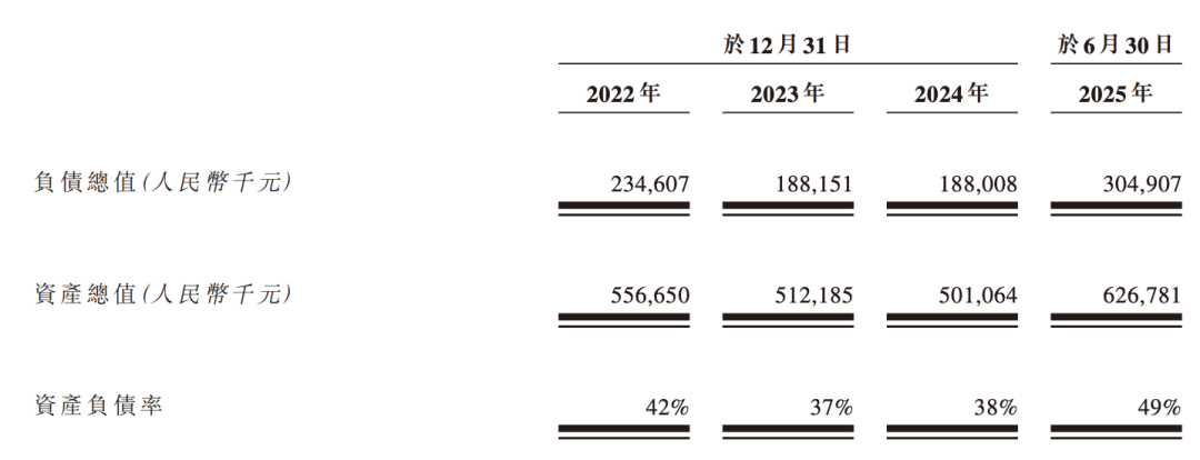 报告期内,卡诺普的负债压力持续攀升,其资产负债率从2022年末的42%升至2025年上半年末的49%。负债总值从2024年末的约1.88亿元增至2025年上半年末的约3.05亿元,半年内的增幅达到了62%。