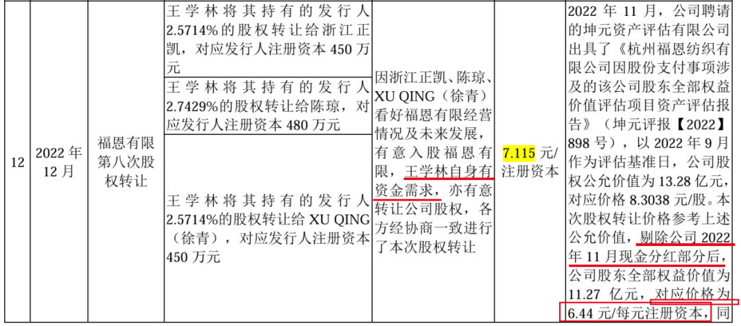 2022年12月,福恩股份曾引入外部投资者。当时,王学林将其所持公司部分出资额分别转让给浙江正凯、陈琼、XU QING(徐青),对应当时的股权比例为2.5714%、2.7429%、2.5714%,代价为7.115元/注册资本,仅略高于剔除分红后的评估价格6.44元/注册资本。