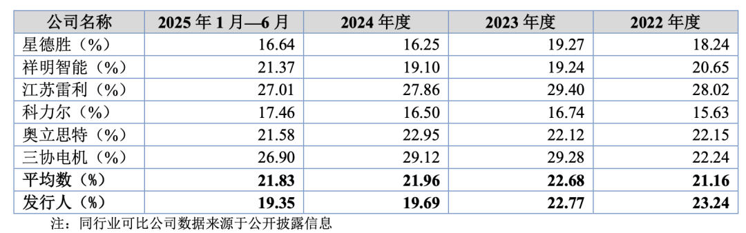 报告期内,晨光电机的同行业可比公司(星德胜、祥明智能、江苏雷利、科力尔、奥立思特、三协电机)的毛利率平均值分别为21.16%、22.68%、21.96%及21.83%。在2024年和2025年上半年,晨光电机的毛利率低于同行业可比公司的平均水平。