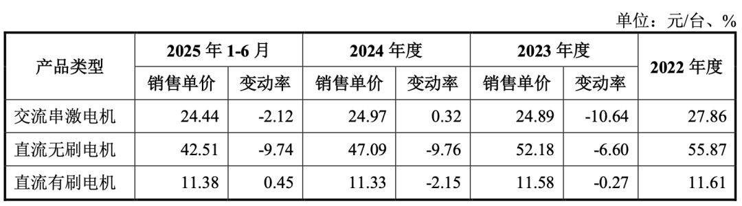 晨光电机的交流串激电机销售单价由2022年的27.86元/台下降至2025年1-6月的24.44元/台,降幅约12.3%;直流无刷电机销售单价由2022年的55.87元/台下降至2025年1-6月的42.51元/台,降幅约23.9%。