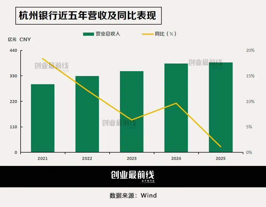 但在业绩方面,2025年杭州银行实现营业收入387.99亿元,同比增长仅1.09%;实现归属于上市公司股东的净利润190.30亿元,同比增长12.05%。