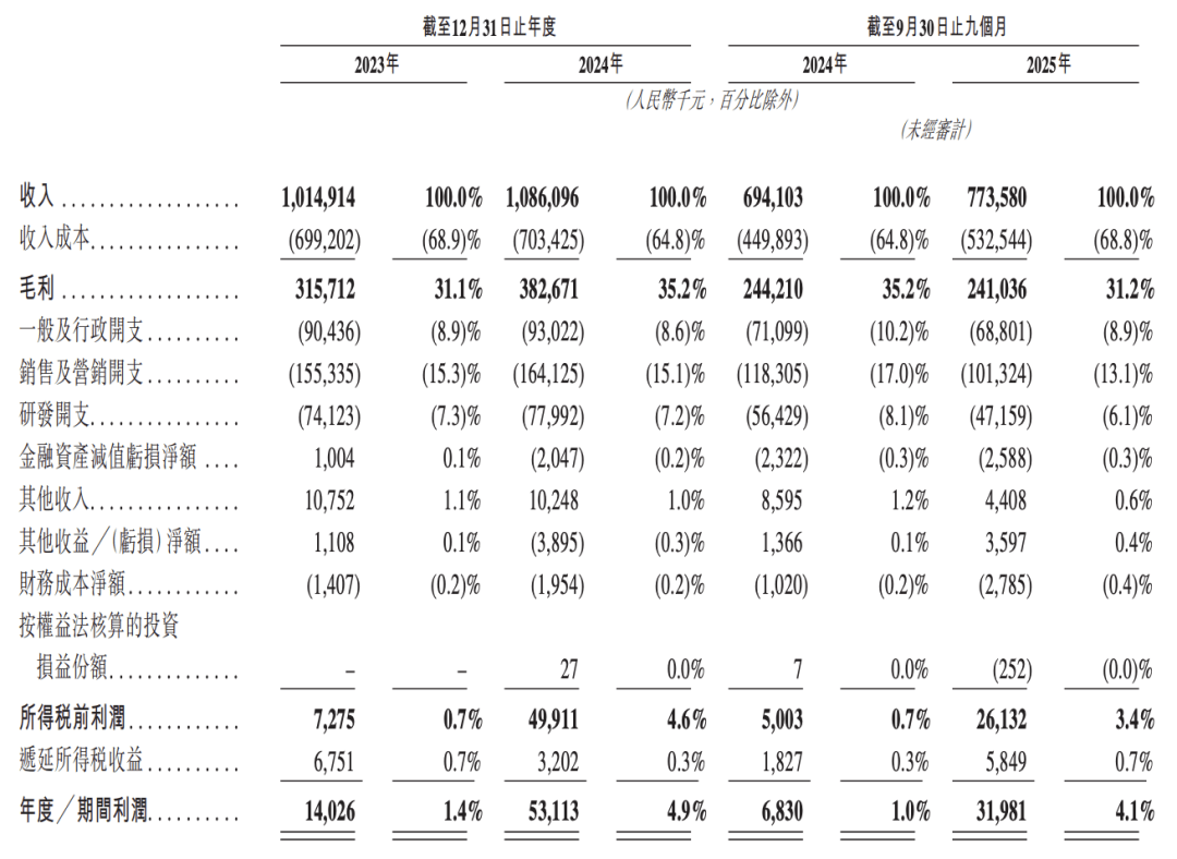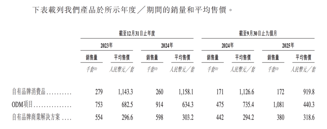 在2023年、2024年和2025年前三季度(以下简称“报告期内”),自有品牌消费品的平均售价分别为1143.3元、1158.1元及919.8元;ODM项目产品的平均售价分别为682.5元、634.3元及440.4元;自有品牌商业解决方案的平均售价为296.6元、303.2元及318.6元。