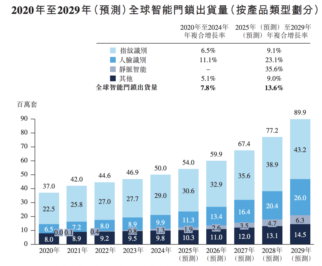 不过需要指出的是,静脉智能锁的出货量在2024年占全球智能门锁出货量的比例仅为1.3%,虽然其2025年至2029年的年复合增长率达到35.6%,但仍是智能门锁行业的小众品类。