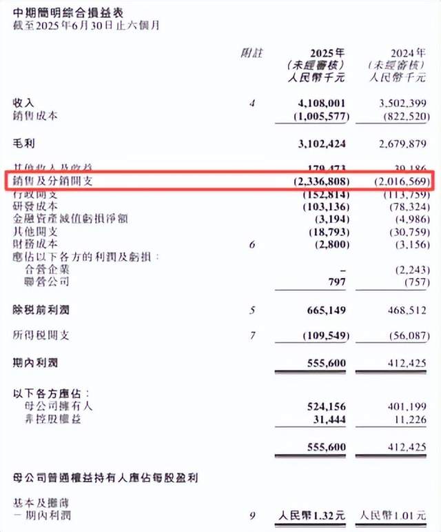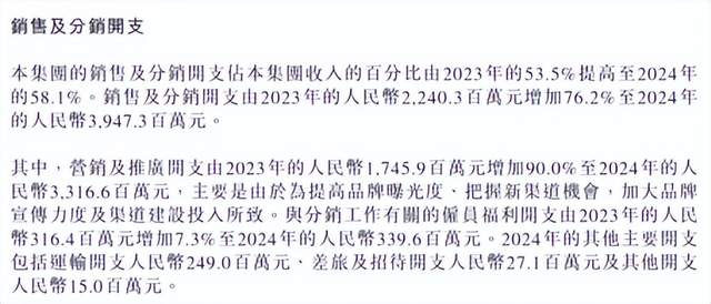 为维持这种增长模式,公司不得不持续投入巨额营销费用。2024年,上美股份销售及分销开支达39.47亿元,同比增长76.21%,占总收入比重高达58.1%。